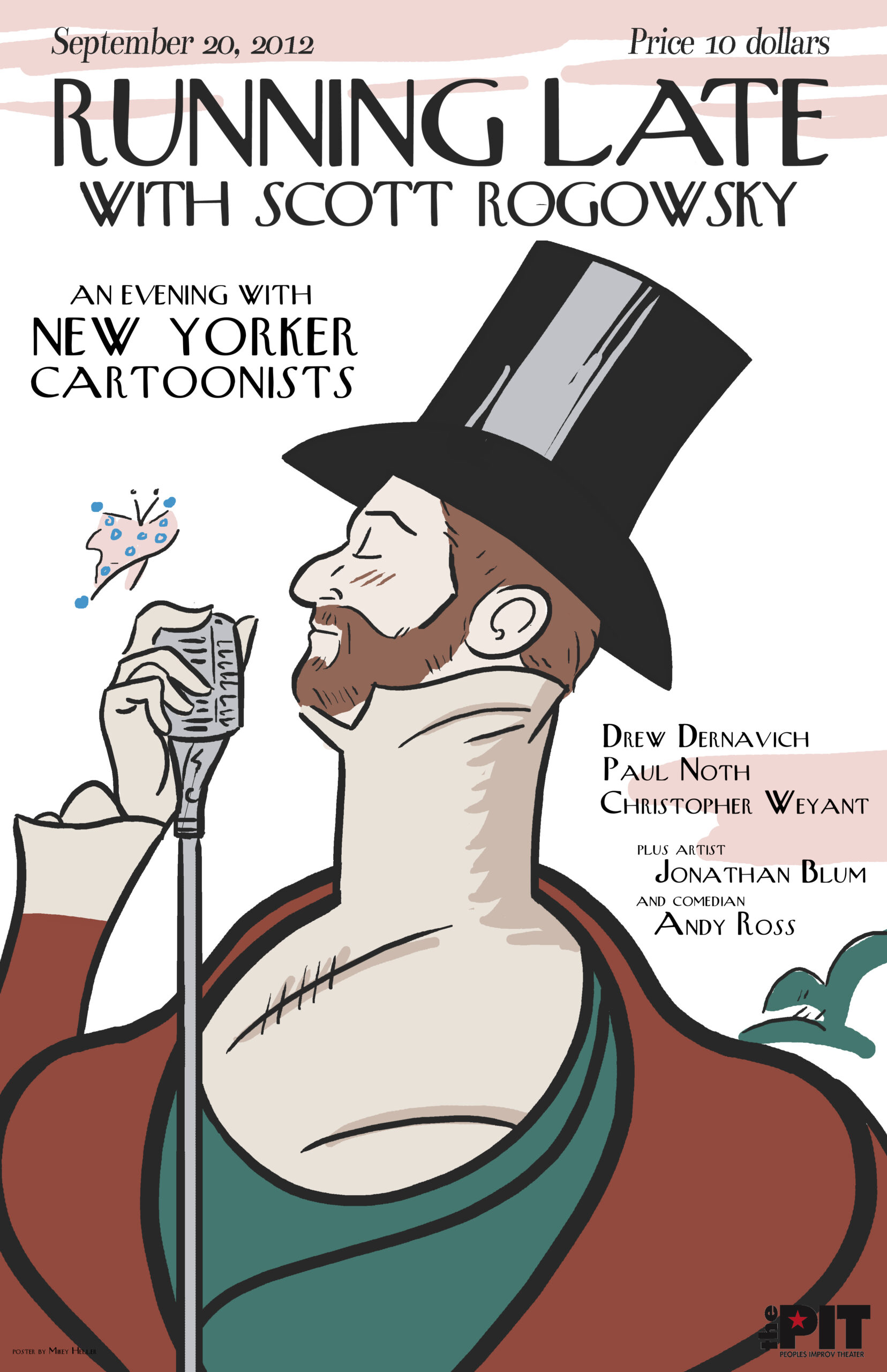 Official, limited-edition print of the September 20, 2012 show featuring NEW YORKER CARTOONISTS (Drew Dernavich, Paul Noth, Christopher Weyant), JONATHAN BLUM (Rabbi Painter), and ANDY BLUM (Real Characters). Poster by Mikey Heller. Hand-numbered out of 20!