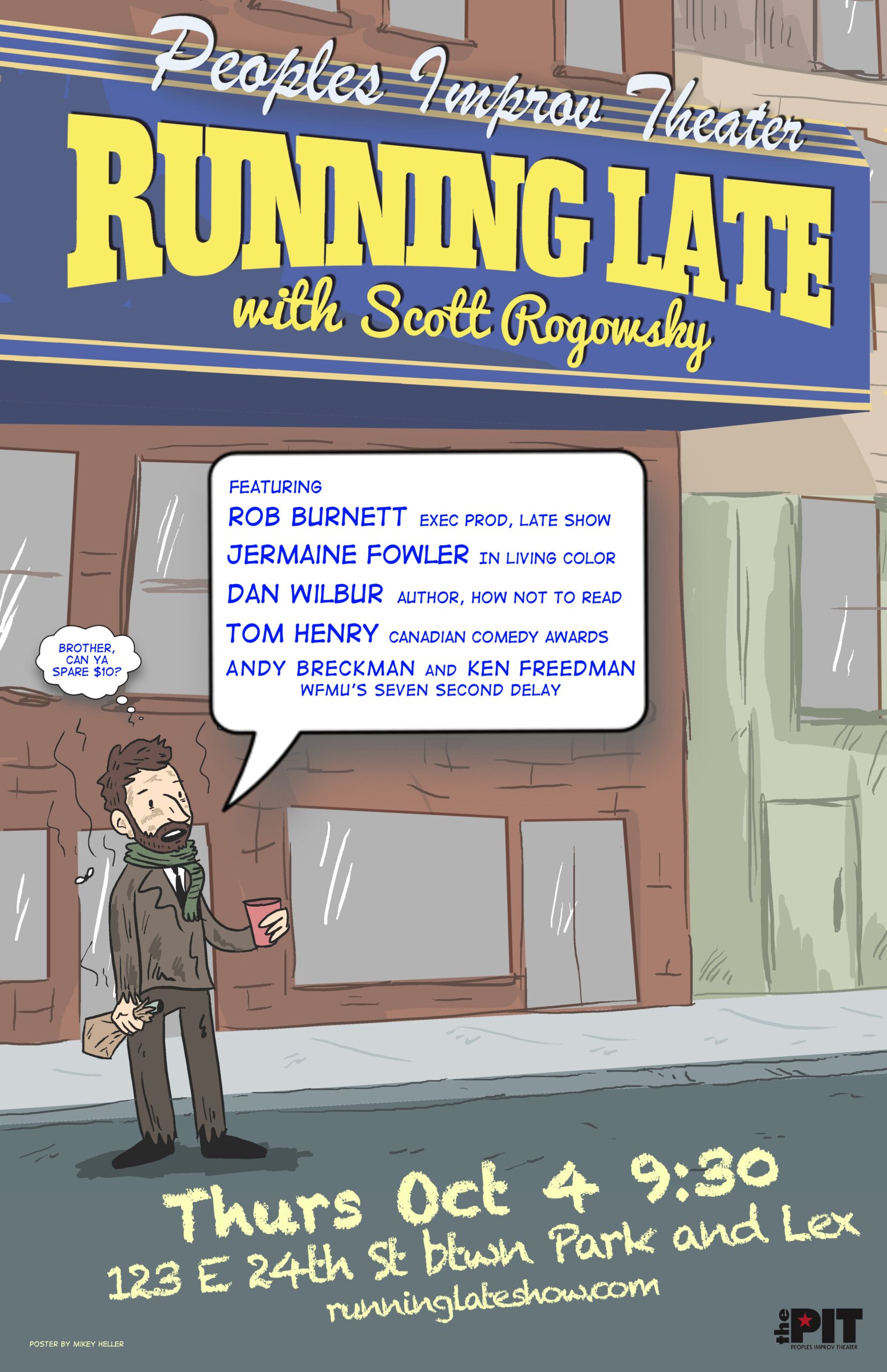 Official, limited-edition print of the October 4, 2012 show featuring ROB BURNETT (Late Show with David Letterman), DAN WILBUR (How Not To Read), KEN FREEDMAN & ANDY BRECKMAN (Seven Second Delay), JERMAINE FOWLER (In Living Color), TOM HENRY (Canadian Comedy Awards). Poster by Mikey Heller. Hand-numbered out of 20!