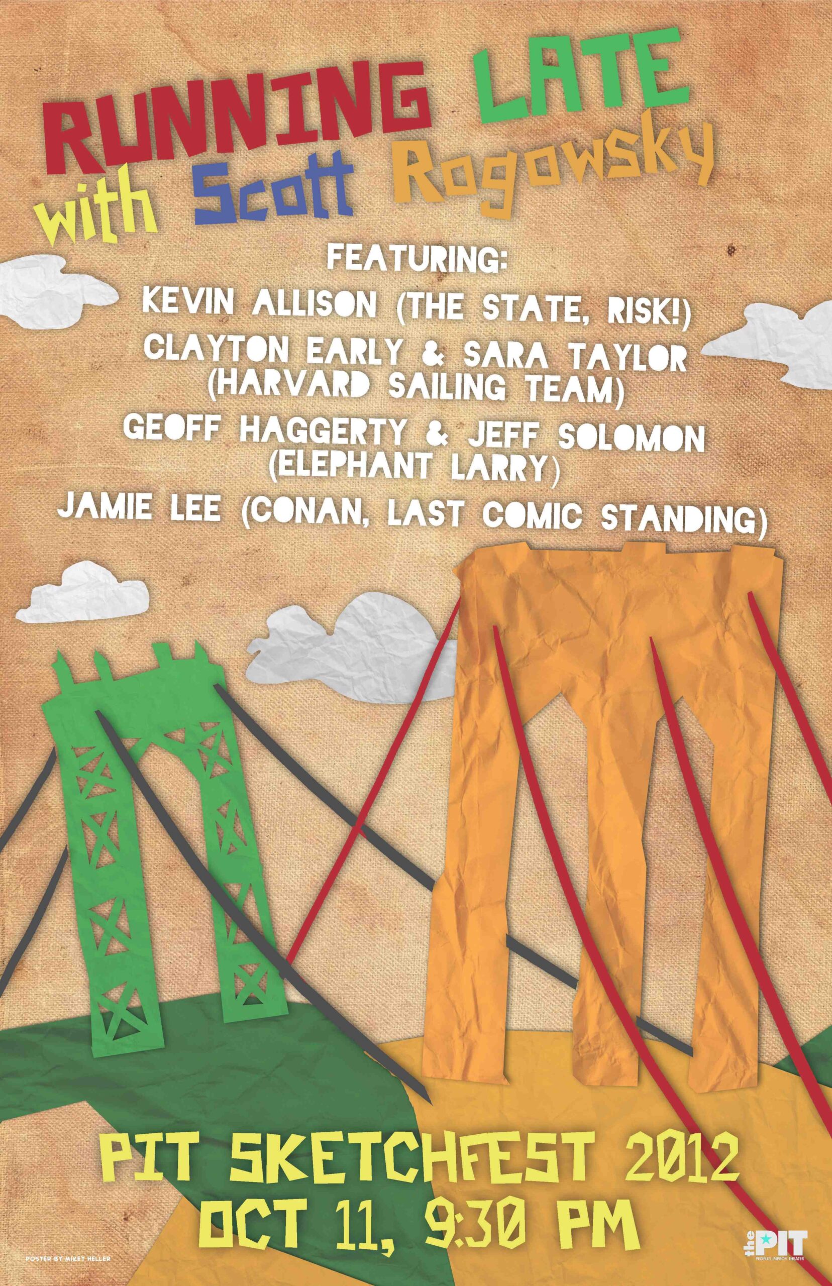 Official, limited-edition print of the October 11, 2012 show featuring KEVIN ALLISON (The State), CLAYTON EARLY & SARA TAYLOR (Harvard Sailing Team), GEOFF HAGGERTY & JEFF SOLOMON (Elephant Larry), JAMIE LEE (Conan). Poster by Mikey Heller. Hand-numbered out of 20!