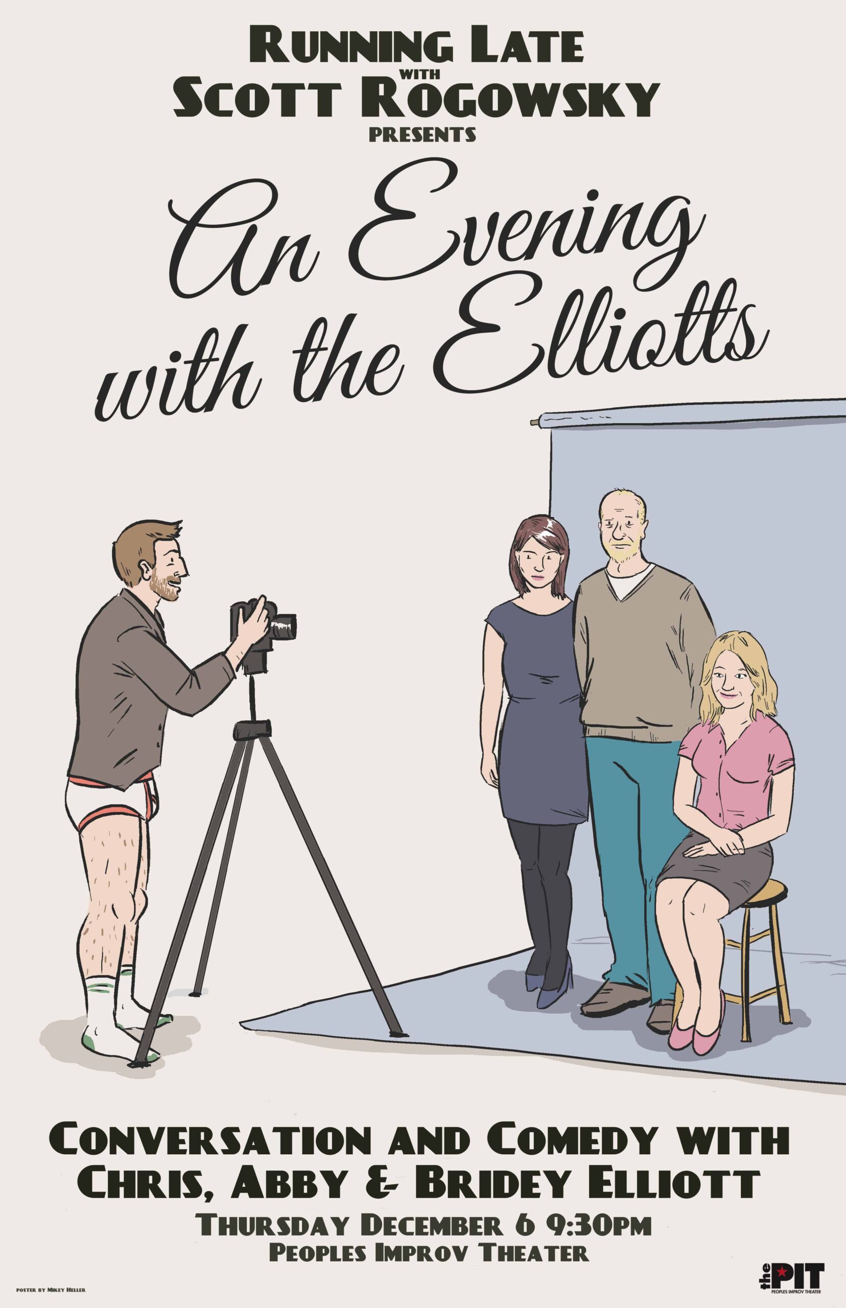 Official, limited-edition print of the December 6, 2012 show featuring AN EVENING WITH THE ELLIOTTS – Chris, Abby, and Bridey together on stage for the first time ever. Poster by Mikey Heller. Hand-numbered out of 20!